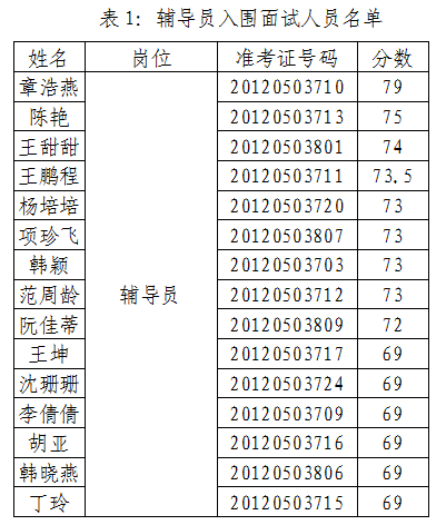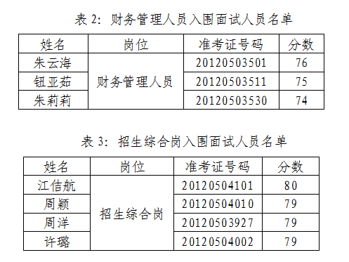 按照笔试成绩从高分到低分,按1:3比例确定面试对象(分数相同时,均进入面试),具体名单如下: