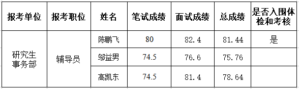 根据《宁波市事业单位公开招聘工作人员实施办法》和2020年浙江大学宁波理工学院公开招聘事业编制工作人员公告》(2020年6月24日),我校2020年公开招聘事业编制工作人员(辅导员岗位3)面试工作已经结束,现将参加该岗位面试考生的面试成绩及总成绩予以公布。按照本次招考公告规定,在面试合格人员中按总成绩从高分到低分按招考计划1:1的比例确定体检、考核对象。